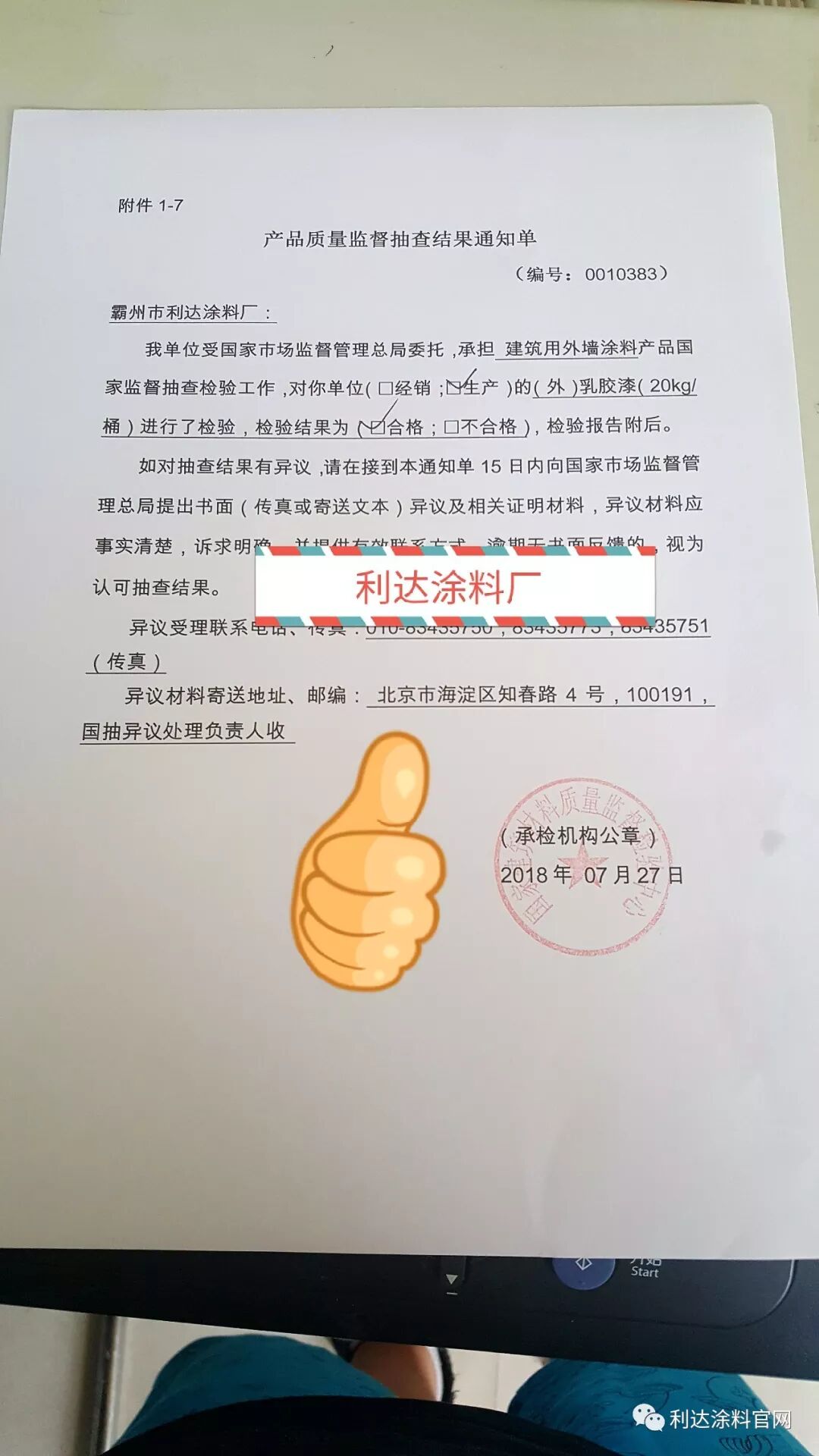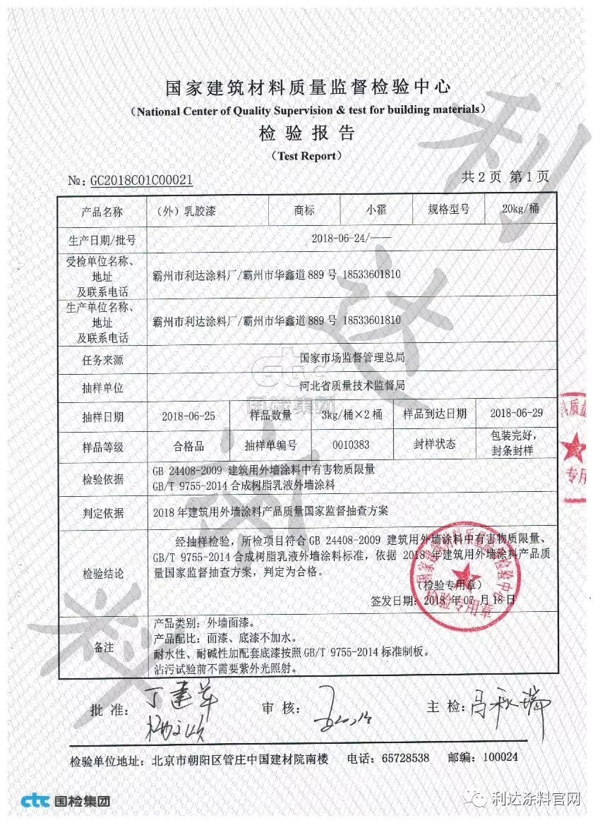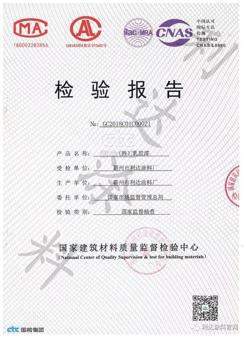 今天上午10点,国家市场监督总局发来利亨元达抽检样品检测报告,检测报告显示我厂生产的外墙涂料产品合格!选择涂料,选择水漆,选择小霍!